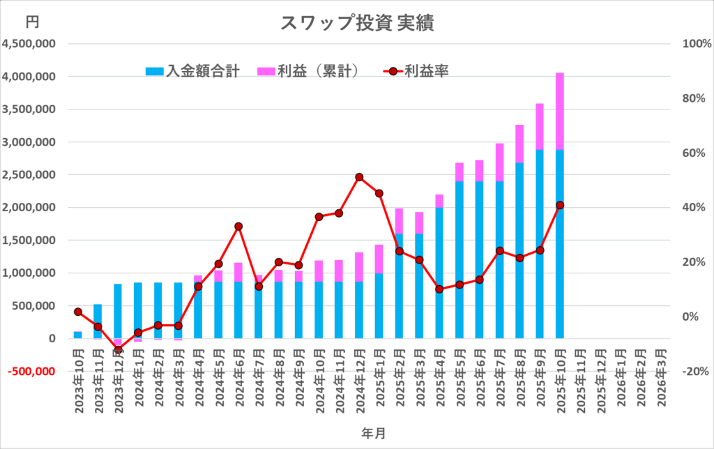 2023年10月に始めて最初の半年はマイナスでしたが、この通り2年間で上手くプラス利益を出すことができました。